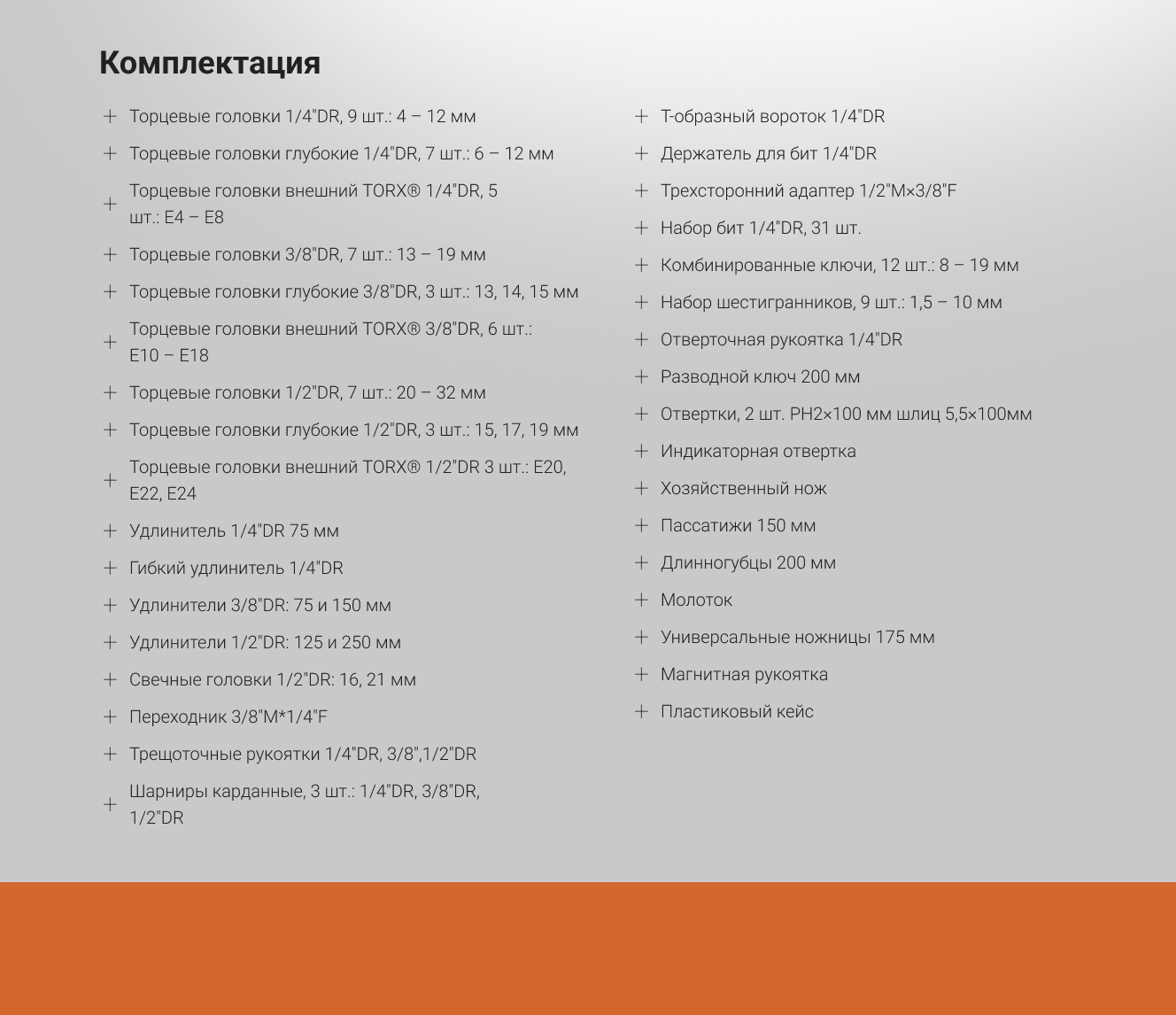 Хороший инструмент ..Выбирал между 94 предмета и 82..Победил 94, потому что в этом наборе головки на 10, 12, 13, 14 есть и на трещетку 1/2 и на 1/4..В наборе 82 предмета, головки 12, 13 (самые распространенные) идут только под маленькую трещетку.Вот это мне не понравилась...А ключи рожковые у меня - есть.. А теперь о главном, этот магаз, задирал цены на весь ассортимент инструмента, почти в 2 раза! Он был дороже чем все остальные магазины...Я был лучшего мнения о этом магазине...Этот набор стоил 11300 в течении трех - четырех недель..У конкурентов этот набор стоил 8490..Не хило так "накруточка"получилась..Постараюсь больше не покупать здесь и не буду рекомендовать этот жаднющий магазин ! Мое имхо..