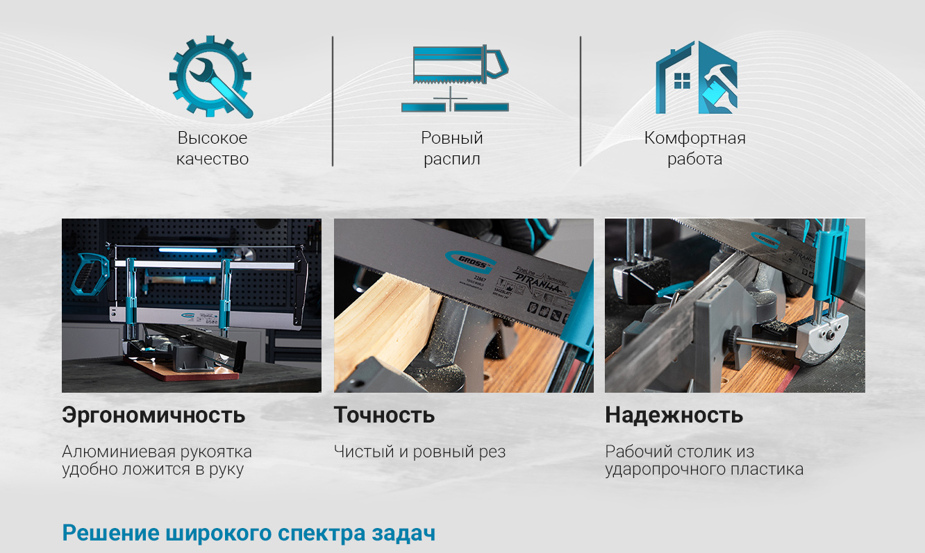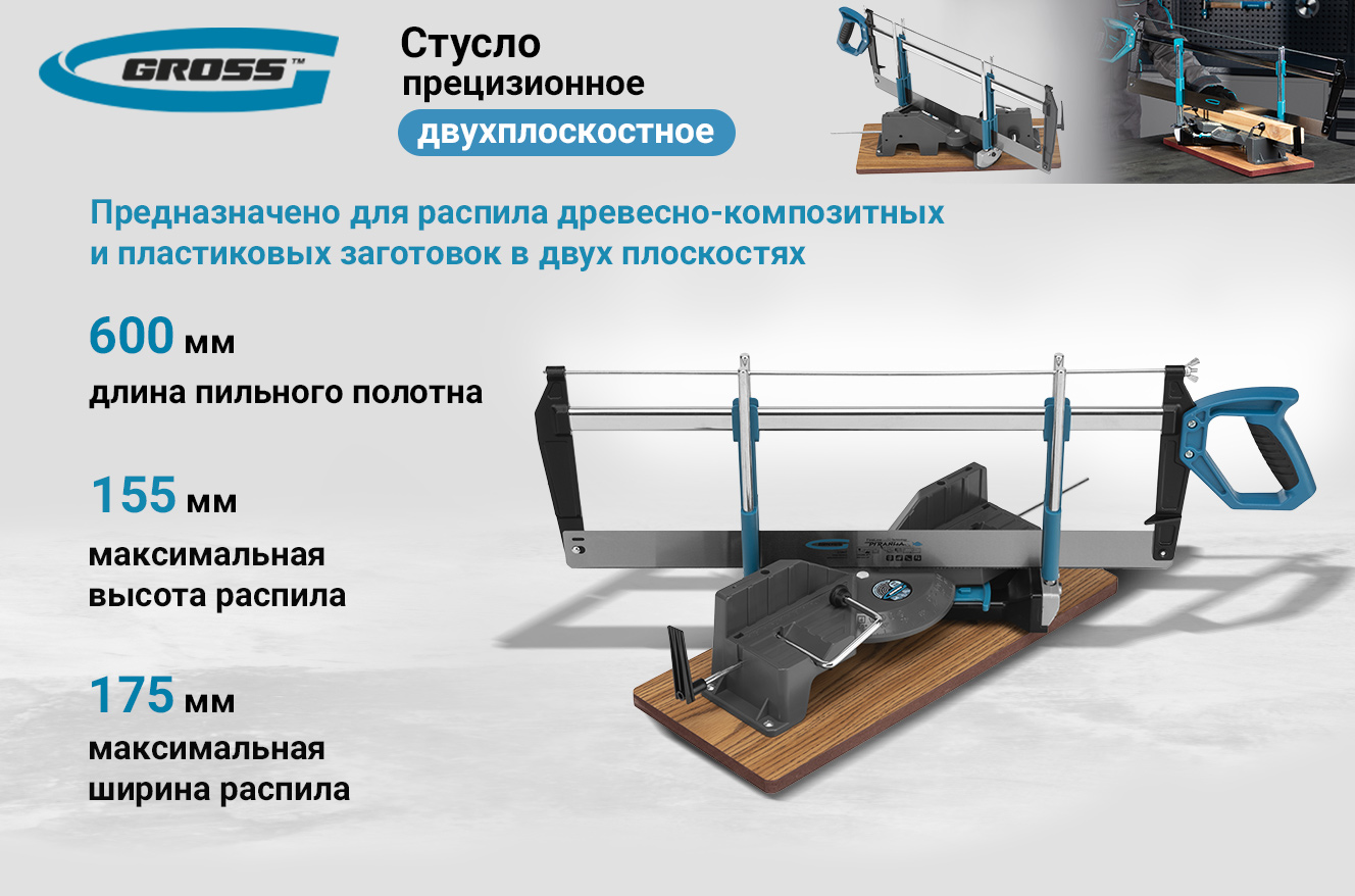 Двухплоскостное прецизионное стусло Gross 22759 с пилой длиной 600 мм, 2 прижимными струбцинами и ограничительным упором предназначен для распила древесно-композитных и пластиковых заготовок в двух плоскостях. Максимальная высота распила составляет 165 мм, ширина — 175 мм. Инструмент рассчитан на проведение профессиональных столярных работ.