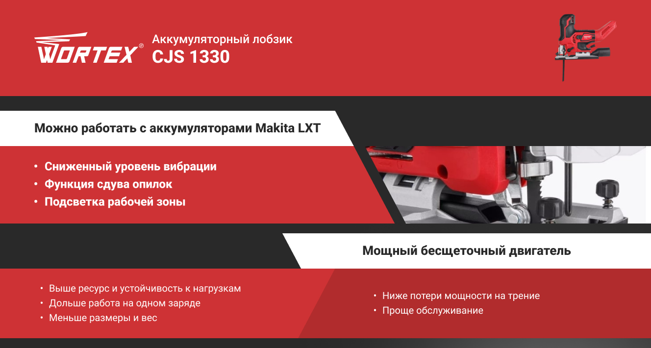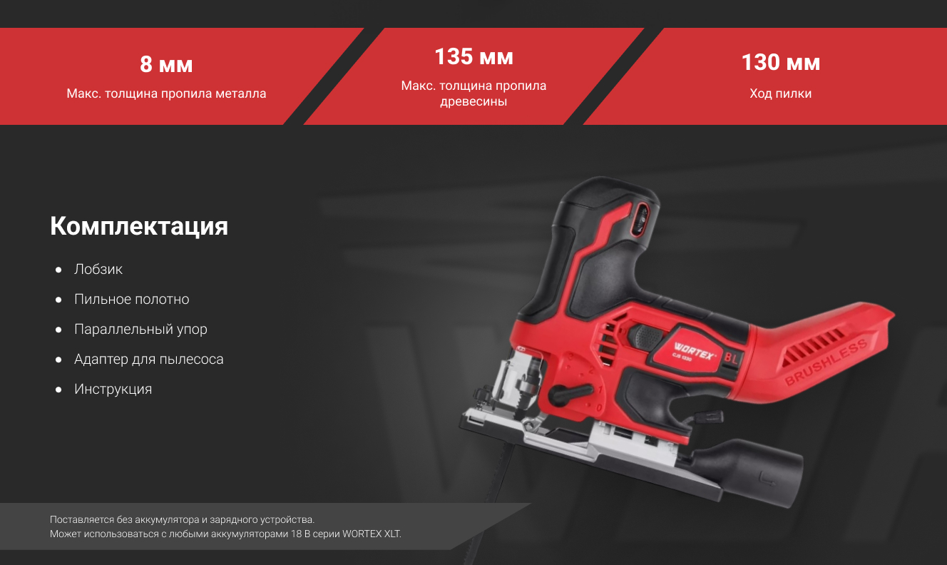 Лобзик аккумуляторный WORTEX оснащен удобной грибовидной рукояткой, бесщёточный двигателем, подсветкой рабочей зоны и функцией сдува опилок. Отличается пониженным уровнем вибрации и возможностью использования в местах без электроснабжения.