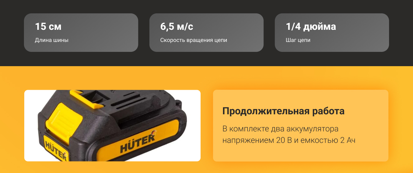 Емкость батареи составляет 2 А*ч, поэтому можно работать без дополнительной зарядки продолжительное время. В комплект входит 2 аккумулятора, что позволяет пилить практически непрерывно. Электропила данной модели отличается высокой производительностью и способна пилить со скоростью 6,5 м/с. Комплектуется инструмент шиной длиной 150 мм (6 дюймов), поэтому не может использоваться для распиливания крупной древесины.