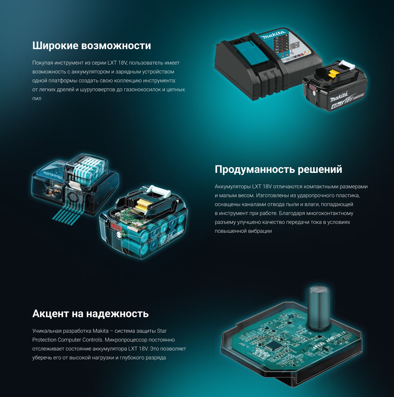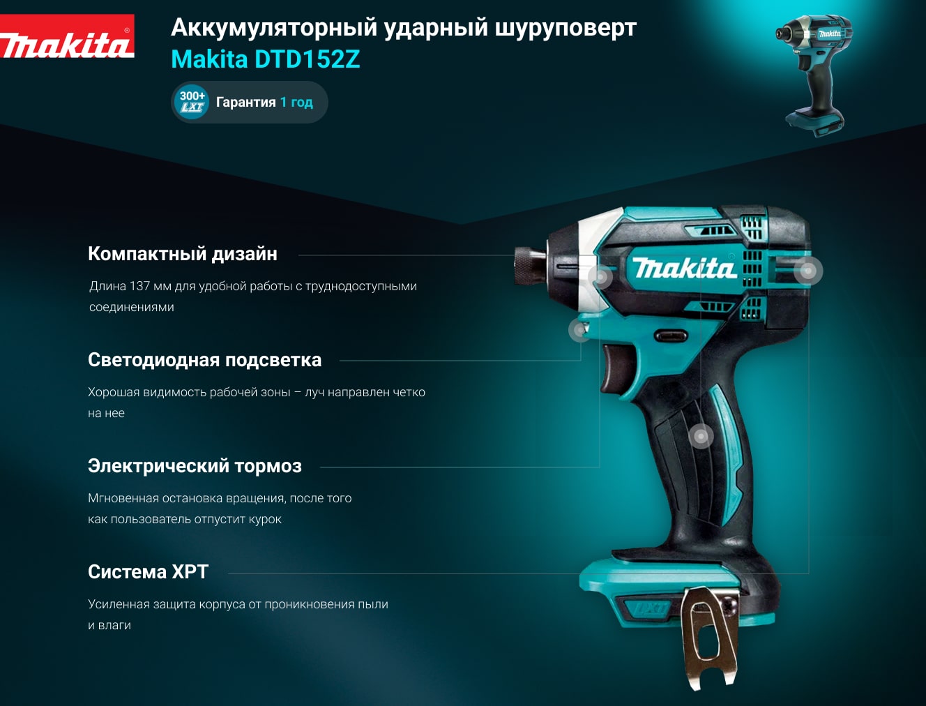 Эргономика (легкий, хорошо сбалансирован, прорезиненные элементы). Компактность (например: длина всего 137мм.). Высокий крутящий момент (165 Н*м.). Качественная яркая подсветка. При работе не передаются нагрузки на руку. Отзывчивая и информативная кнопка включения (возможность тонкой регулировки частоты оборотов нажатием на кнопку включения). Высокие обороты (до 2900 об/мин.). Работает на аккумуляторах серии Makita LXT. Наличие достаточного количества сервисных центров Makita в любом регионе. Скоба для крепления на пояс. Электрический тормоз. Резиновый защитный ободок в передней части инструмента. Возможность замены щеток двигателя без замены двигателя. Хорошая цена в комплектации «Z» (без АКБ, без зарядки, без кейса, + возможность использования бонусов «Спасибо» от Сбербанка до 40% от цены).