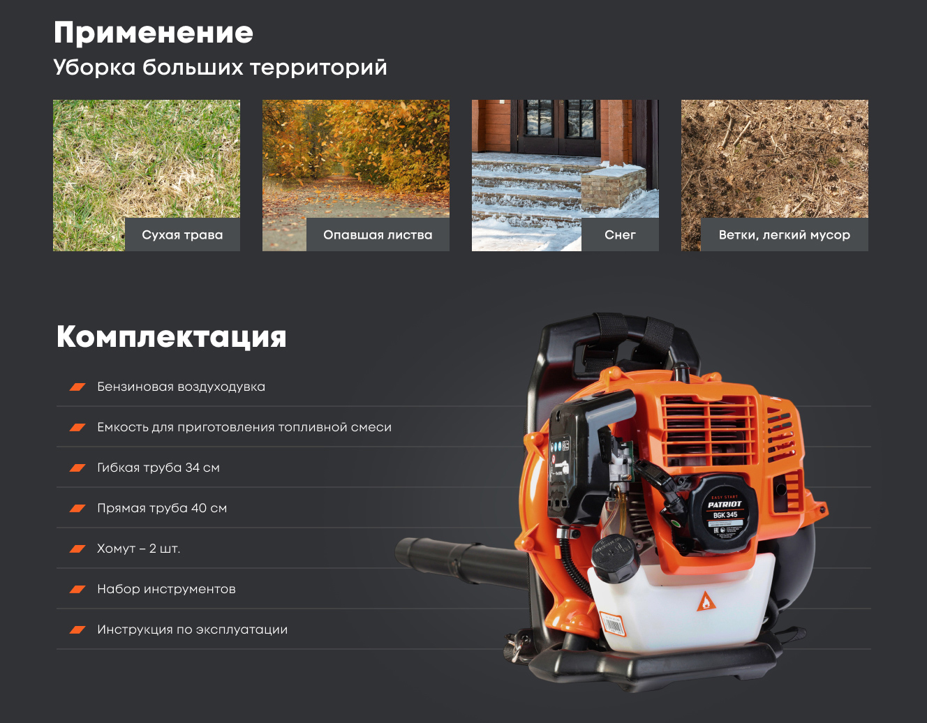 Эффективная работа. Благодаря двухтактному двигателю скорость воздушного потока достигает 60 м/с, что позволяет производить уборку эффективно и быстро.