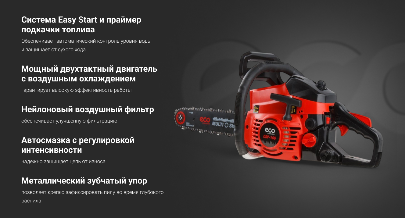 Удобно расположенные топливный насос (праймер) и винт натяжения цепи; хорошо сбалансированная конструкция; полноценный комплекс безопасности – инерционный тормоз, уловитель цепи, защита от случайного включения; антивибрационная система; автоматическая подача масла на трущиеся элементы пильной части.