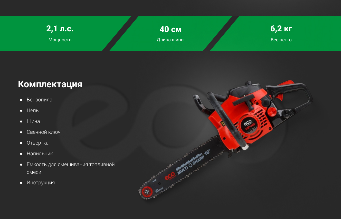 Бензопила ECO CSP-166 шина 40 см (16), 3/8 LP, 1.3 мм, 57 звеньев EC1560-6
