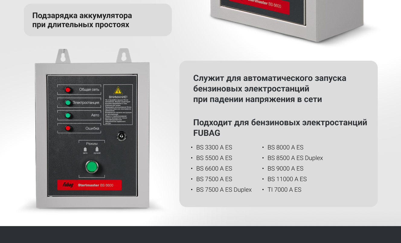 Блок автоматики Startmaster BS 6600 230V двухрежимный для бензиновых станций FUBAG 41 015 обеспечивает автоматический запуск электростанций FUBAG BS 3300 A ES, BS 5500 A ES, BS 6600 A ES, BS 7500 A ES, BS 8500 A ES, BS 11000 A ES, TI 7000 A ES в случае падения напряжения в основной сети. В режиме ожидания блок автоматики производит зарядку бортового аккумулятора станции для поддержания его в рабочем состоянии.