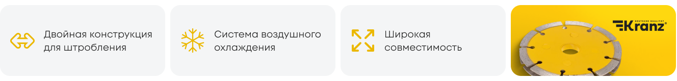 Диск алмазный двойной KRANZ — это высококачественный инструмент для штробления различных строительных материалов. Он эффективно обрабатывает природный и искусственный камень, армированный и неармированный бетон, кирпич, керамику и керамогранит.