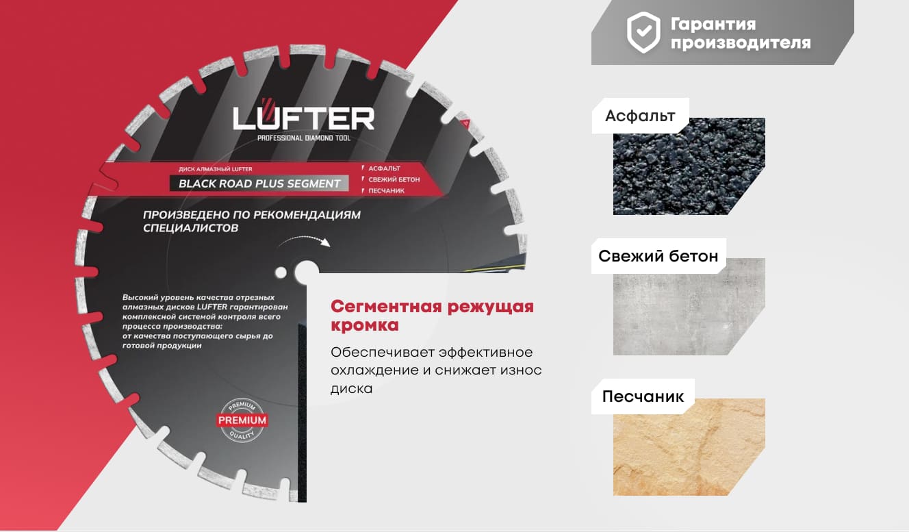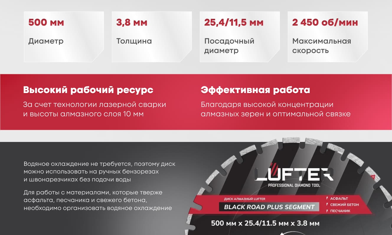 LUFTER BLACK ROAD PLUS SEGMENT 500 мм предназначен для сухой резки абразивных материалов, таких, как асфальт, свежий бетон.