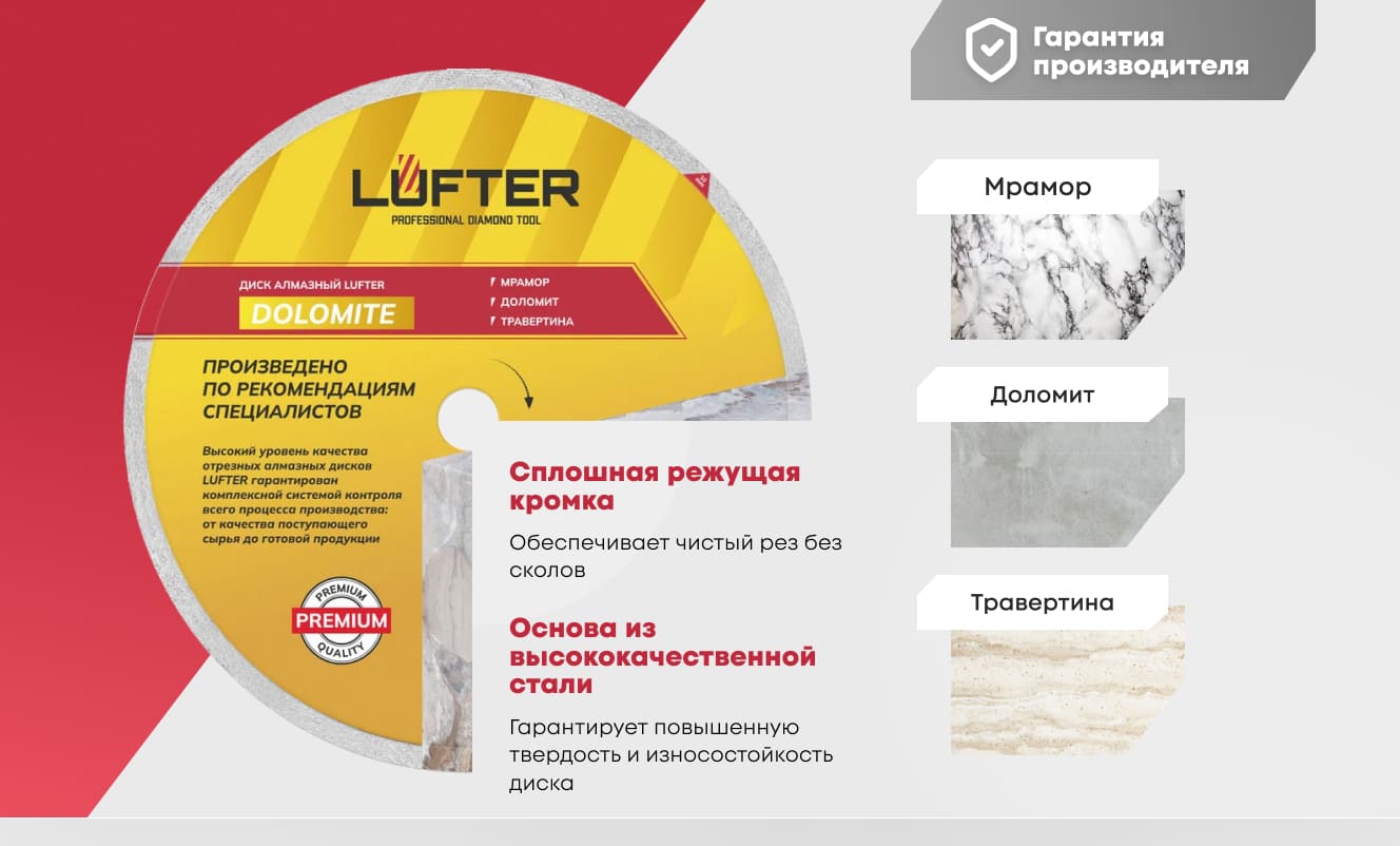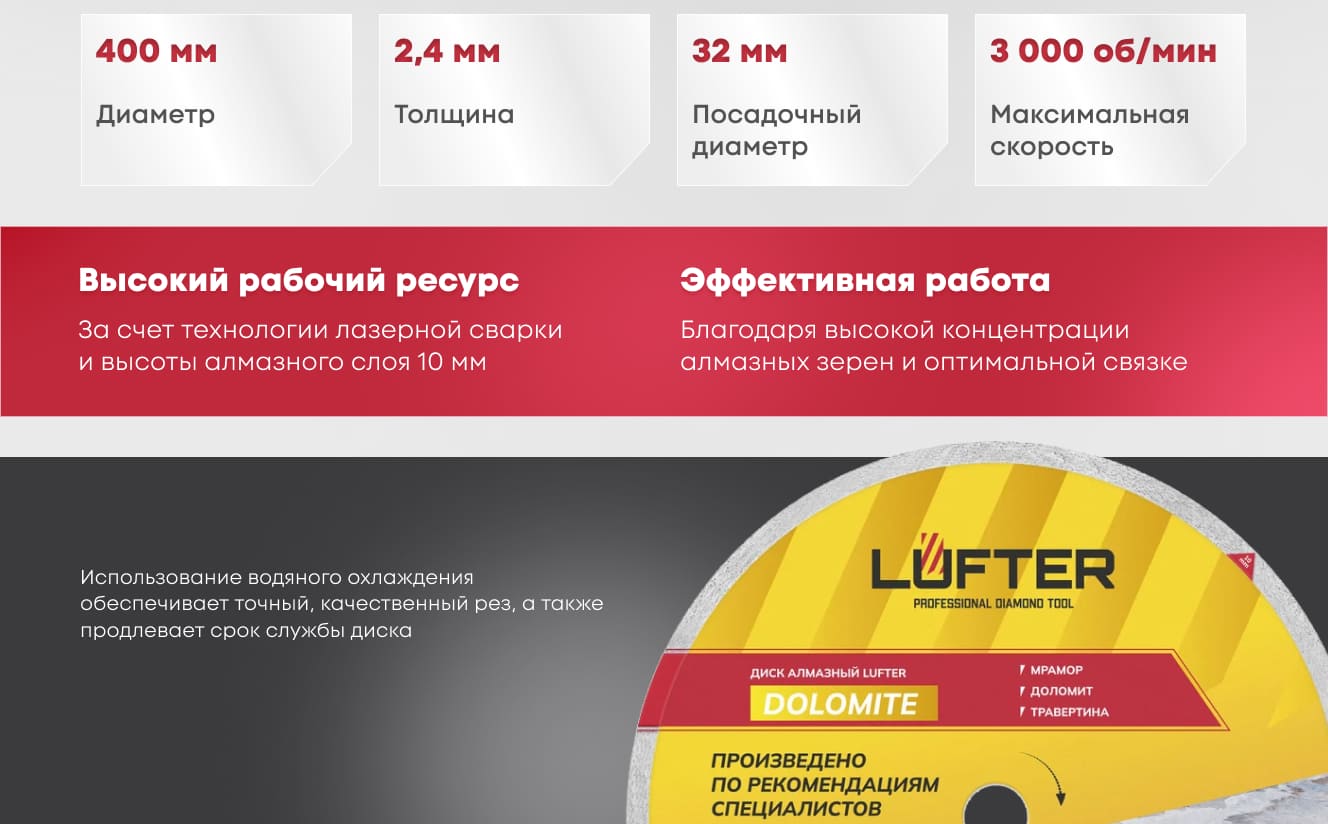 LUFTER DOLOMITE 400 мм предназначен для высококачественного мокрого реза доломита, травертина и мрамора (мягкие и средние породы).