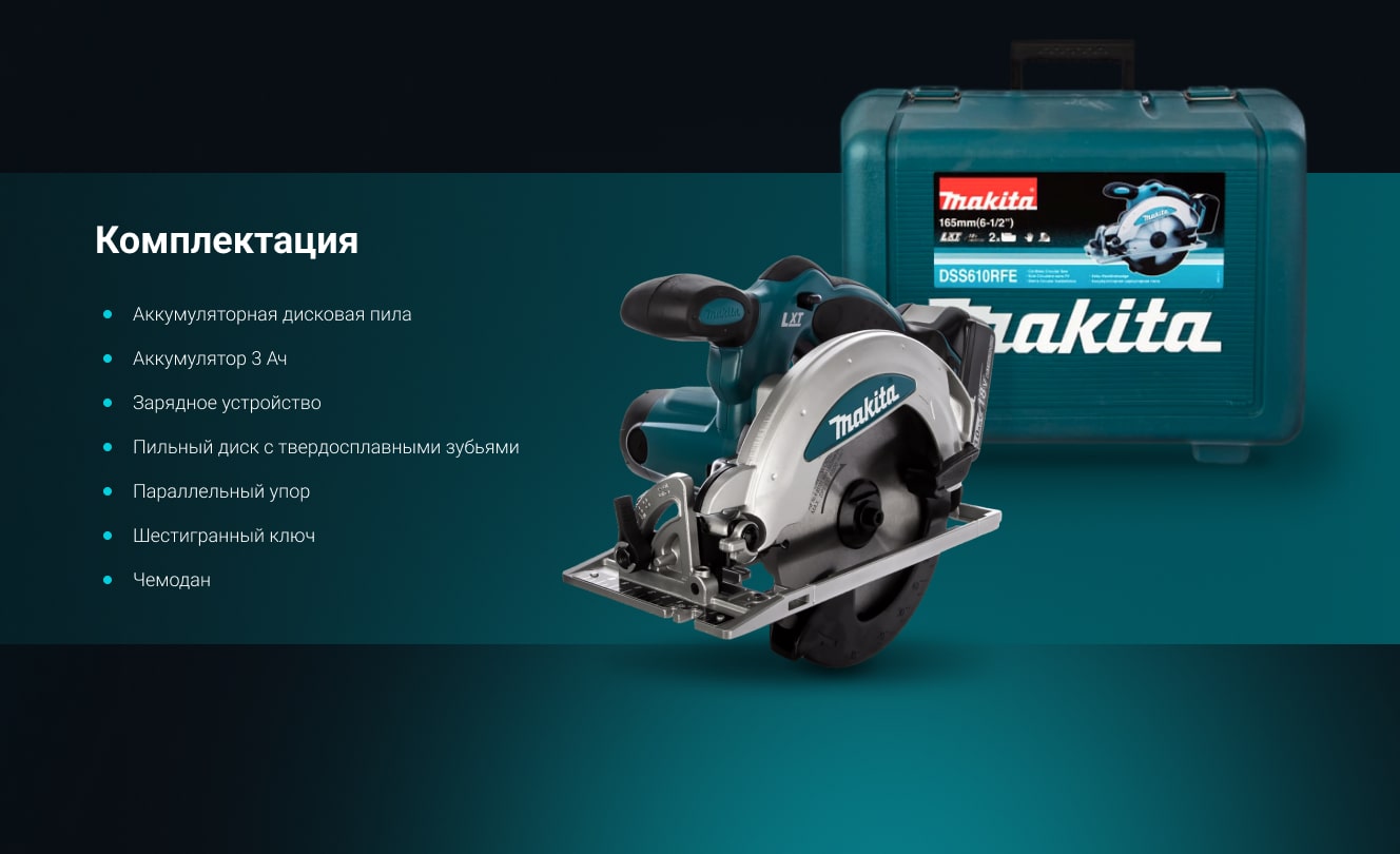 Дисковая пила Makita LXT DSS610RF служит для продольного и поперечного распила древесины. Источником питания является литий-ионный аккумулятор напряжением 18 В.