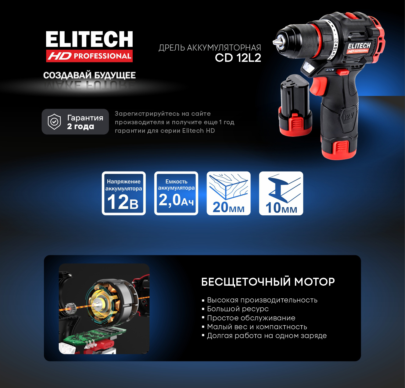 Дрель аккумуляторная ELITECH HD CD 12L2 с Li-Ion аккумулятором напряжением 12 В, высоким крутящим моментом 40Hм и максимальной скоростью вращения 1600 об/мин предназначена для сверления отверстий в черных и цветных металлах, дереве и производных материалов на его основе (фанера, ДСП, OSB, МДФ и подобные), различных видов пластика и для установки крепежа.