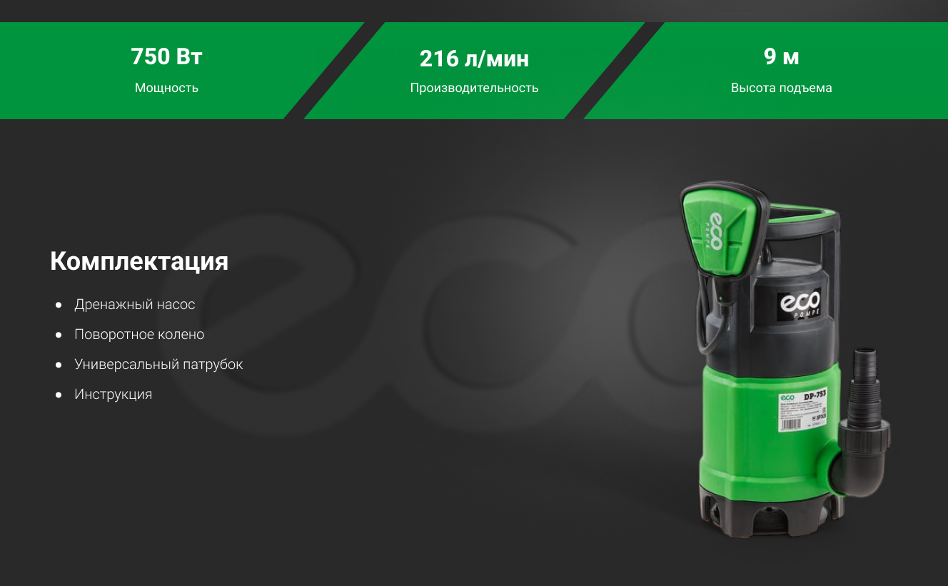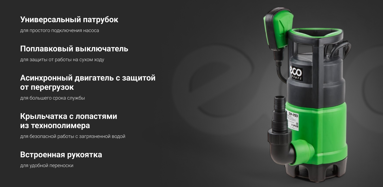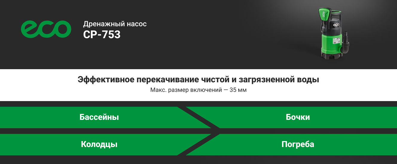 Дренажный насос ECO DP-753 применяется для перекачки чистых и загрязненных жидкостей с максимальным диаметром взвешенных частиц до 35 мм.