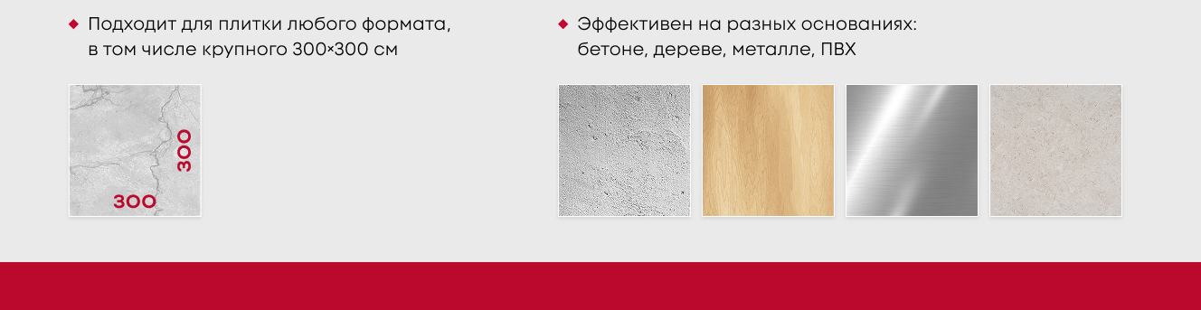 - Для плит любого формата и любых оснований (бетон, дерево, металл, ПВХ)