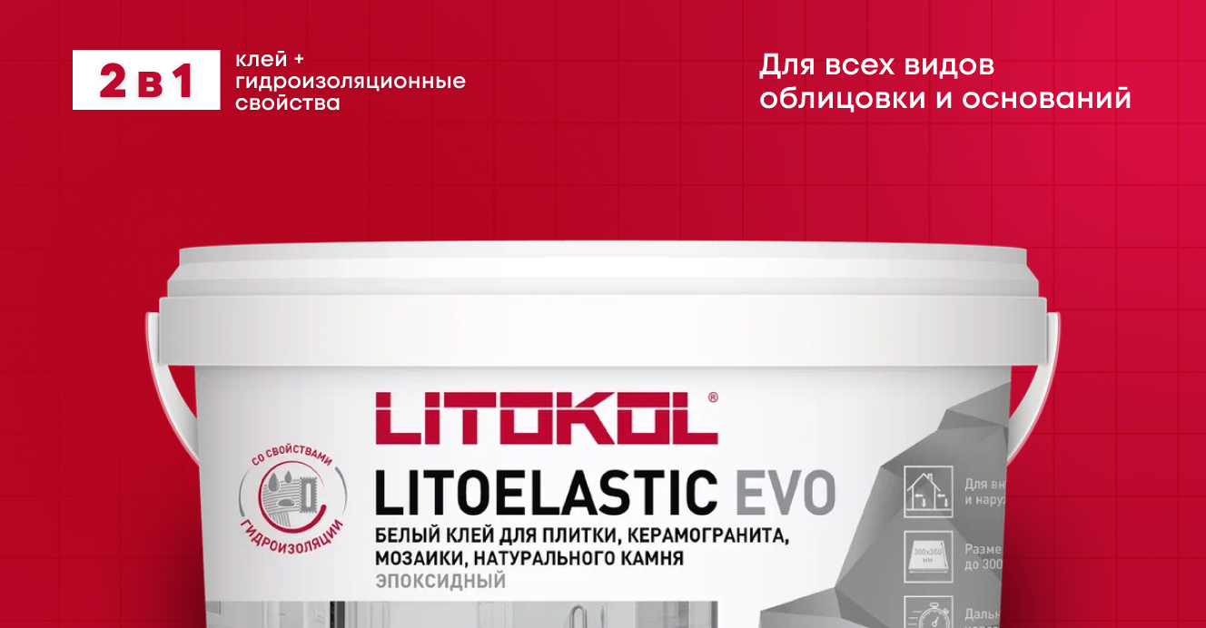 LITOELASTIC EVO — белый двухкомпонентный плиточный клей премиум-класса для надежной укладки зеркальной мозаики, керамической плитки, керамогранита и камня. Продукт сочетает в себе клей и гидроизоляцию, обеспечивая прочное сцепление и защиту от влаги.