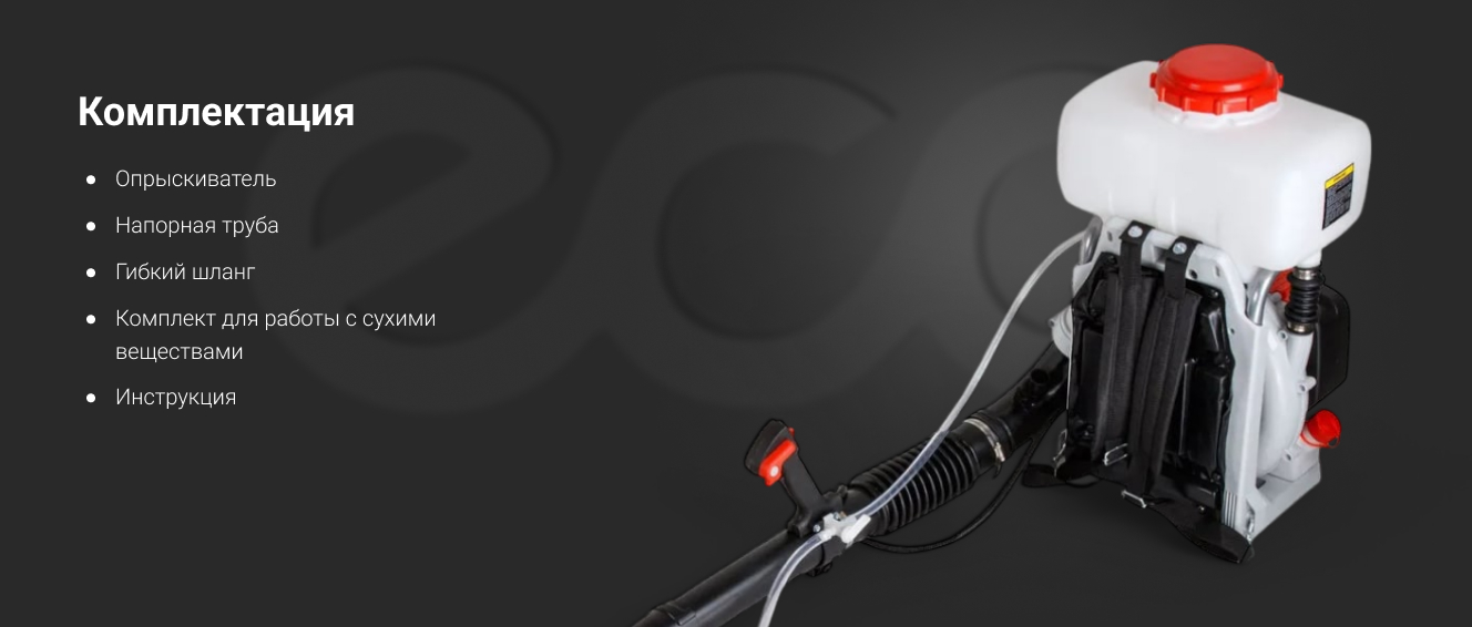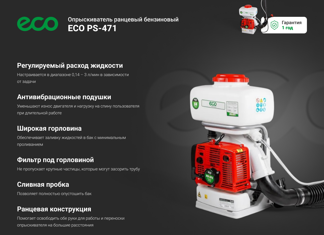 Ранцевый бензиновый опрыскиватель ECO PS-471 предназначен для использования в домашнем хозяйстве, для эффективной обработки растений средствами защиты и подкормки удобрениями на приусадебных участках, в питомниках и садах.