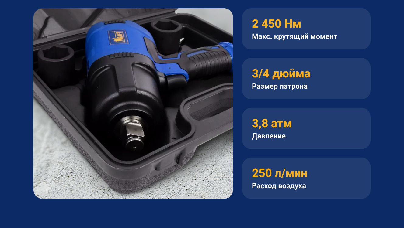 Пневматический ударный гайковерт KRAFT 3/4 2450 н.м., в кейсе с головками KT 707015