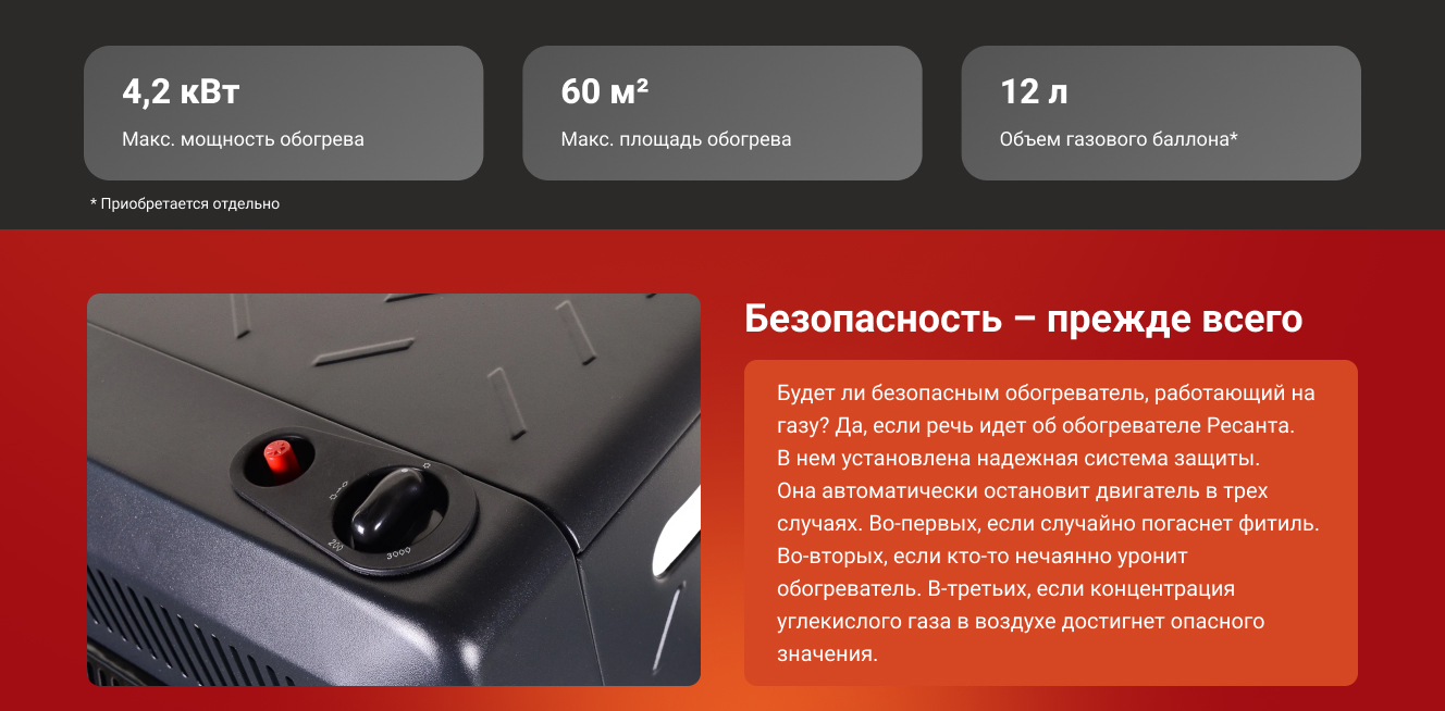 В модели Ресанта ПГ-4200С предусмотрено автоматическое отключение, если концентрация СО2 в воздухе достигла 0,8-1,5%. Также есть защита от затухания, от ударов и падений.