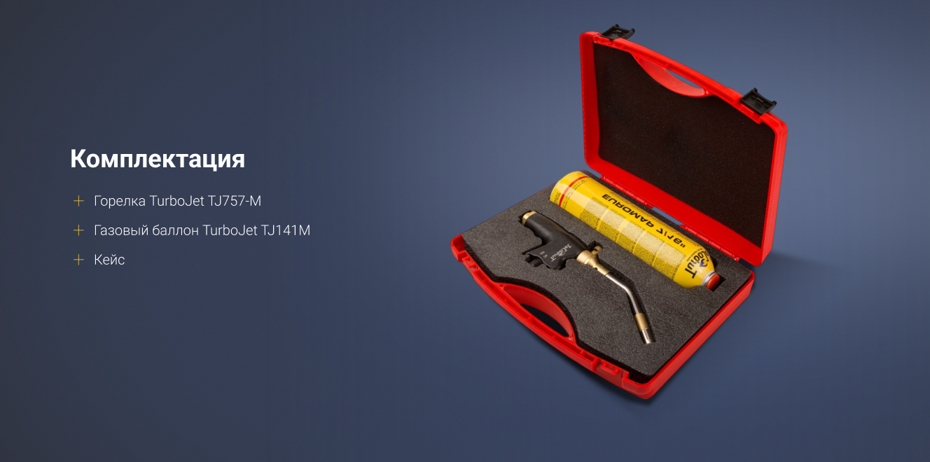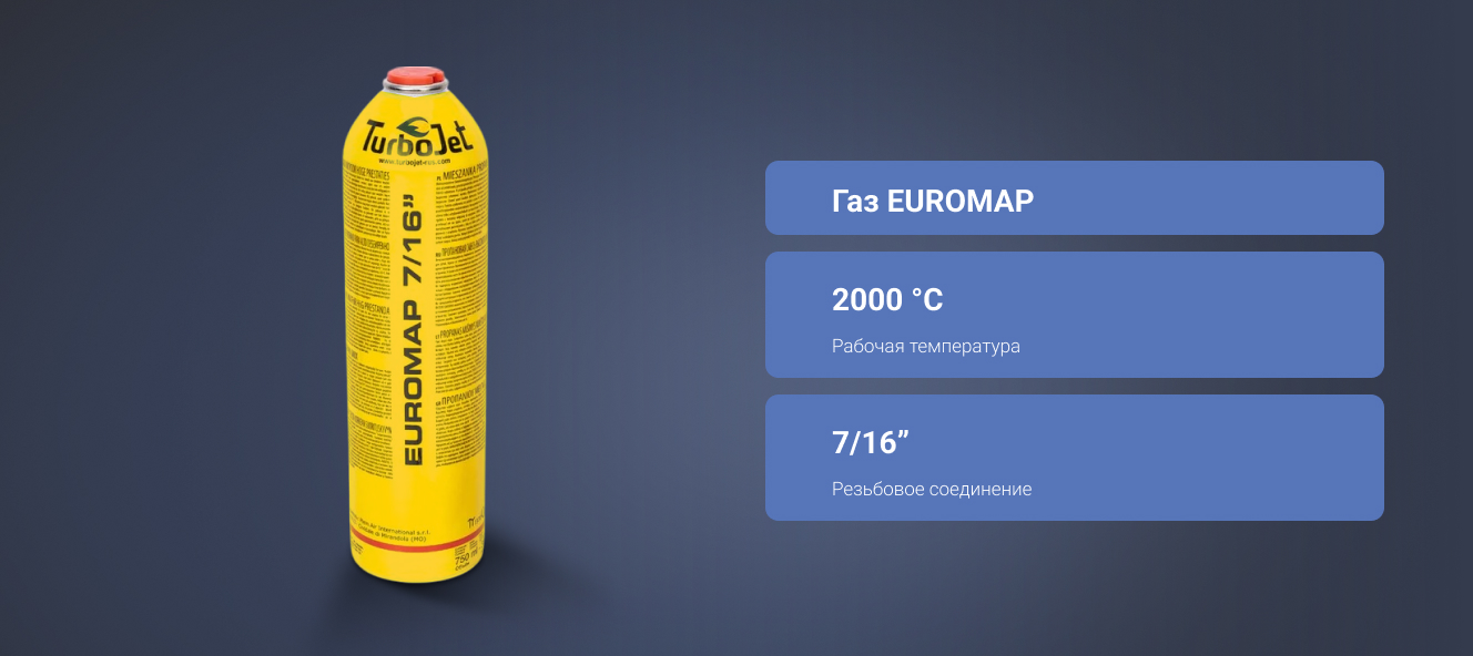 В набор входит удобная и надёжная горелка с пьезоподжигом TJ2000-GA и баллон TJ750GA с газом EUROМАP.