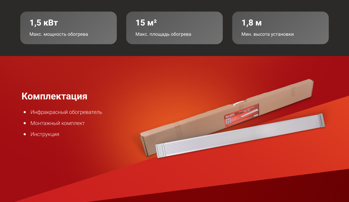 - Площадь обогрева инфракрасного обогревателя ИКО-1500 Ресанта 67/5/1 - 15 кв.м;