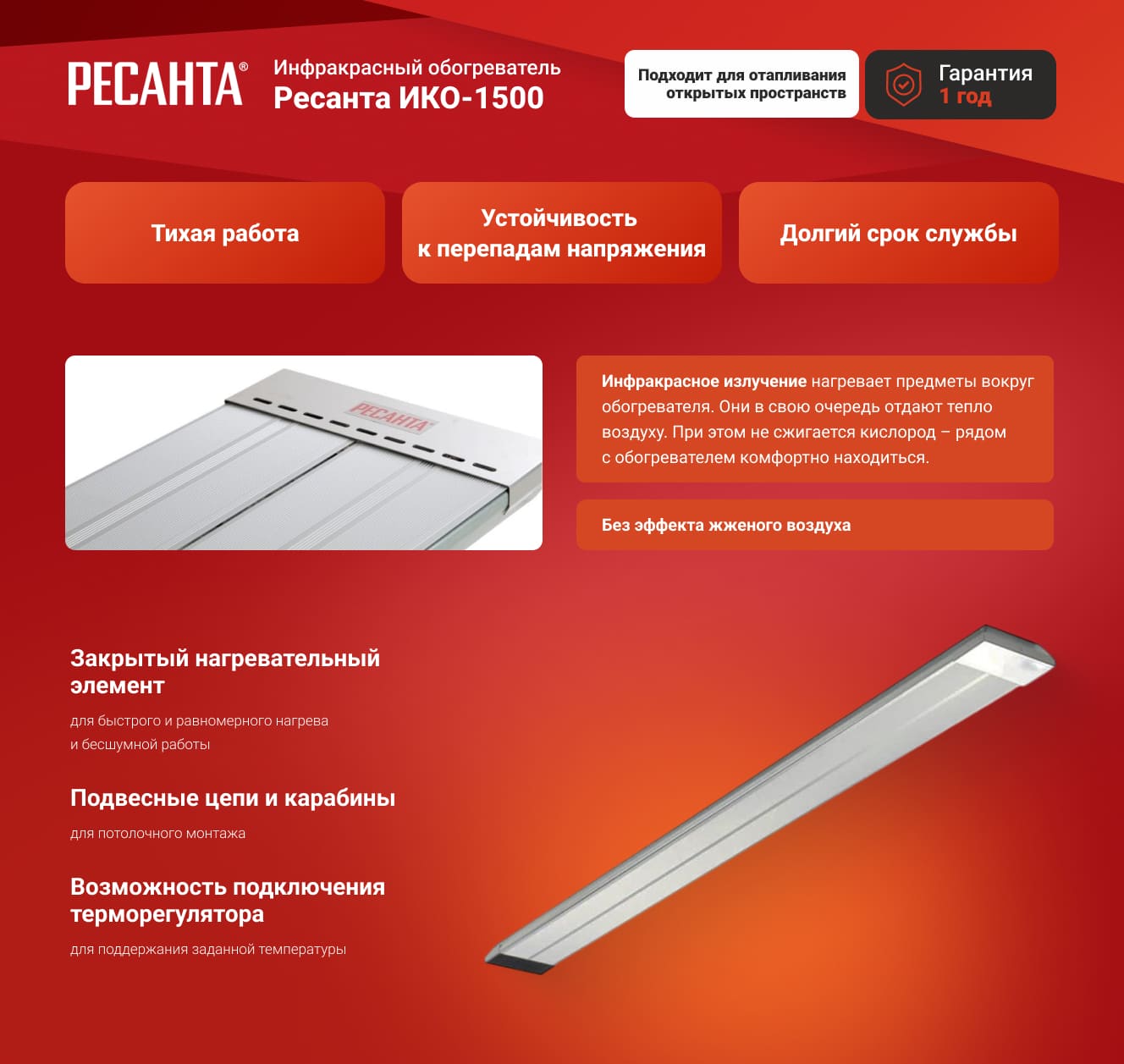 Инфракрасный обогреватель Ресанта ИКО-1500 имеет мощность 1500 Вт, что достаточно для использования на площади до 15 кв. м. Благодаря небольшому весу 5 кг и наличию в комплекте креплений и цепей прибор можно подвесить под потолком. Излучение помогает сэкономить электроэнергию и за счет естественной конвекции снизить количество поднимаемой с пола пыли. Устройством можно отапливать открытые пространства.
