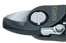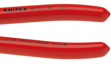 Кабелерез KNIPEX KN-9521165 с предохранительным зажимом и винтовым самофиксирующимся шарниром. Предназначен для резки медных, алюминиевых, одножильных и многожильных кабелей диаметром 15 мм и сечением до 50 кв. мм. Гладкий и чистый рез обеспечивается благодаря прецизионной шлифовке режущих кромок. Корпус изготовлен из кованой инструментальной стали, закаленной в масле, что существенно повышает эксплуатационные характеристики инструмента. Не предназначен для резки стальной проволоки и холодно тянутых медных проводов.