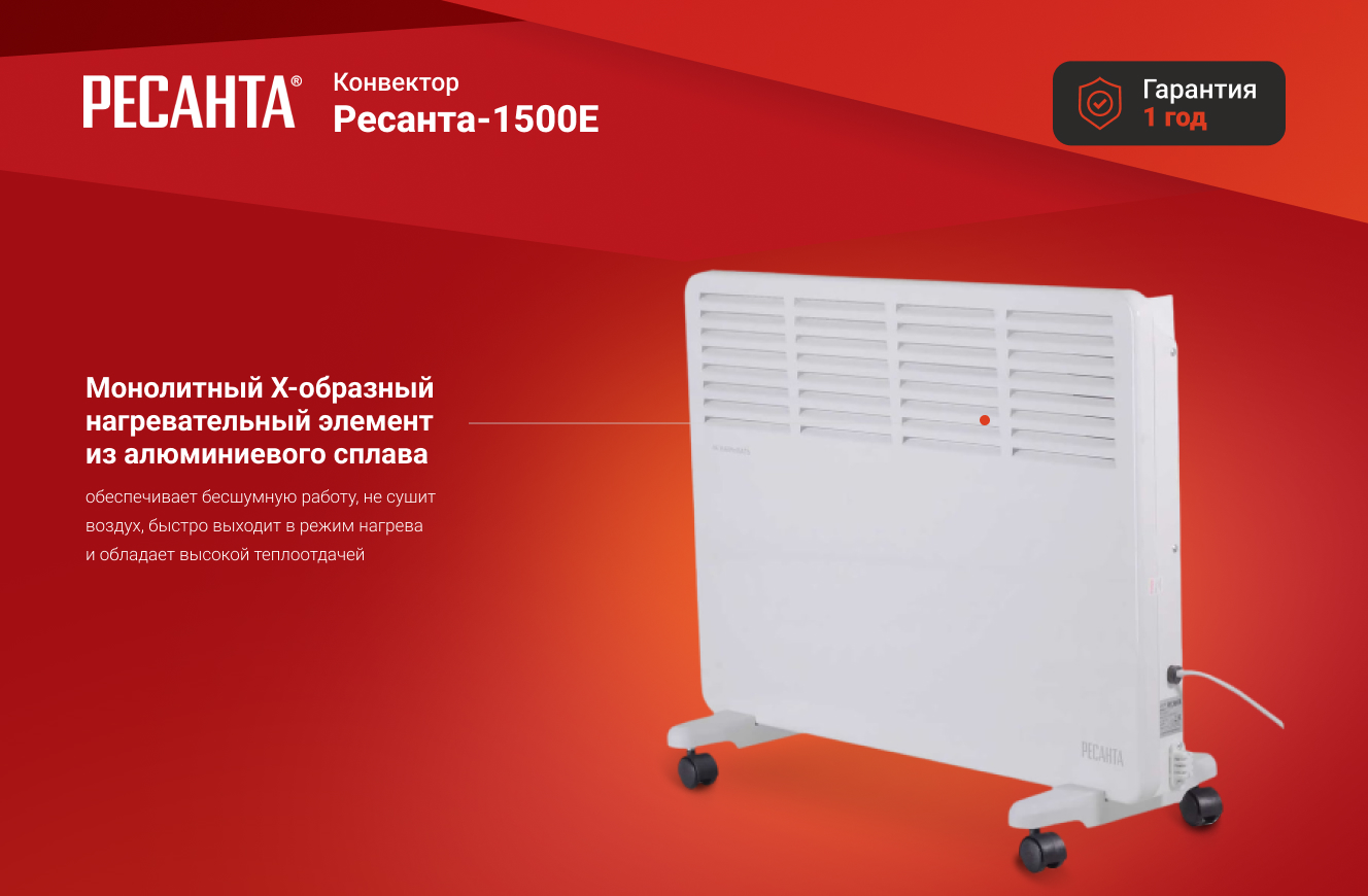 Электроконвектор Ресанта ОК-1500Е — это удобное управление, моментальный выход на максимально установленный режим и эффективный обогрев. Конвектор работает на двух регулируемых максимальных мощностях – 1.5 и 0.75 кВт и имеет монолитный Х-образный нагревательный элемент, который отличается высокими теплообменными характеристиками и бесшумностью работы как во время нагрева, так и при остывании. Он не выжигает кислород в помещении и не пересушивает воздух.