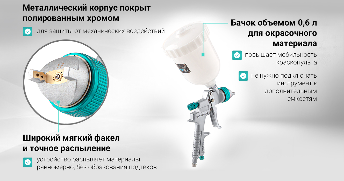 - Металлическая конструкция краскораспылителя STELS AG 801 HVLP 57360 прослужит долгие годы;