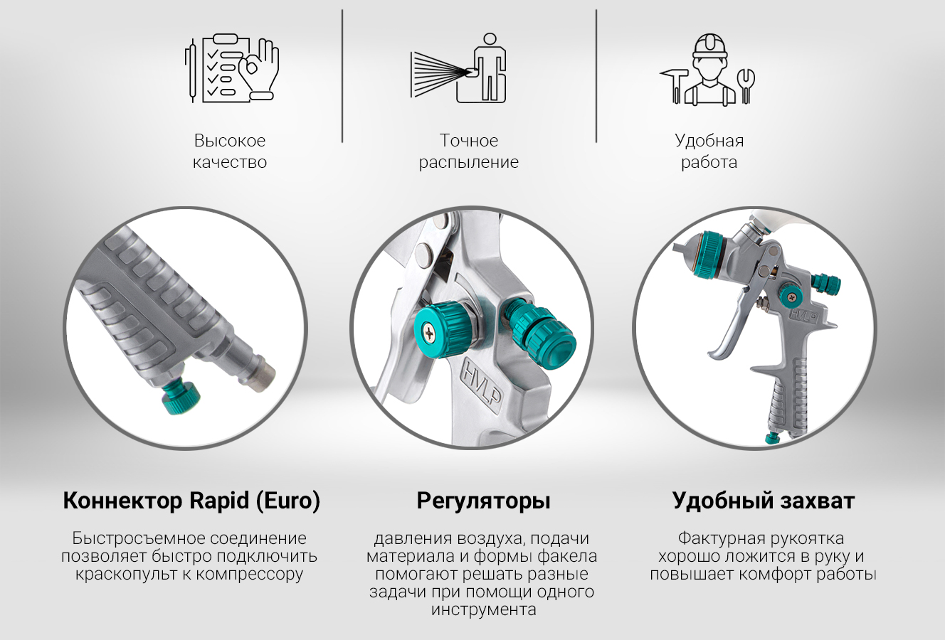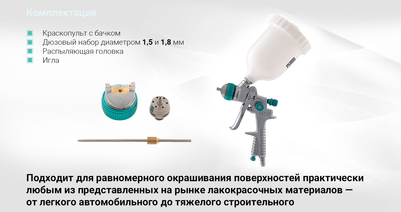 - Система HVLP (High Volume Low Pressure) - высокий объем, низкое давление;