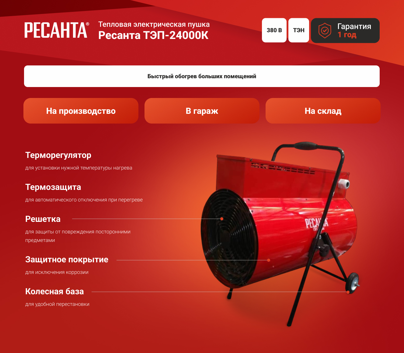 Электрическая теплопушка Ресанта ТЭП-24000К предназначена для обогрева и вентиляции помещений любого назначения. Агрегат питается от электрической сети напряжением 380-400 В и потребляет 24 кВт во время работы в максимальном режиме.