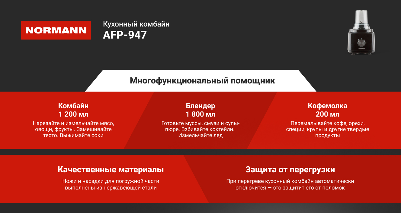 Кухонный комбайн NORMANN AFP-947 предназначен для бытового применения.