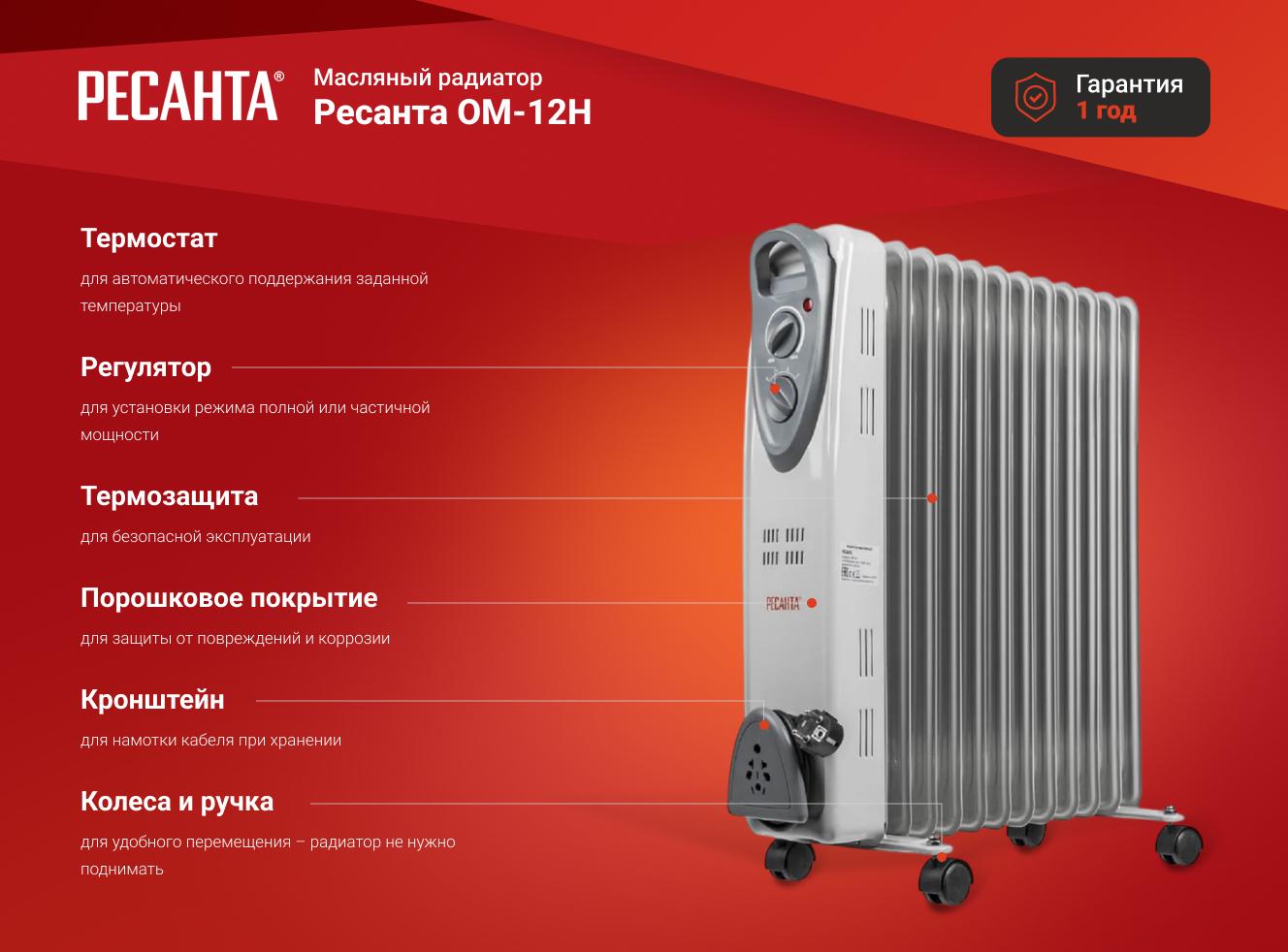 Масляный радиатор Ресанта ОМ-12Н - бытовой электрический прибор, который используется для отопления помещений. Имеет три режима нагрева и регулятор мощности, что позволяет производить обогрев с необходимой интенсивностью. Данная модель имеет самую высокую мощность среди радиаторов серии OM и позволяет отапливать помещения площадью до 35 м2.