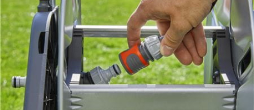 Угловое соединение на внутренней стороне катушки предотвращает перегиб шланга - для стабильного потока воды.