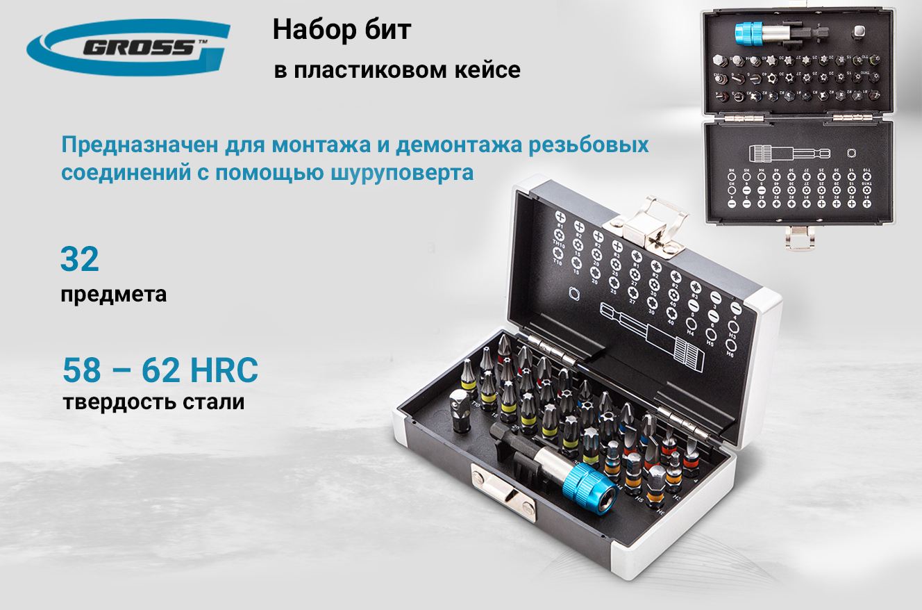 Набор бит с магнитным адаптером Gross 11363 из стали S2, в пластиковый кейсе, включает в себя 32 предмета для монтажа и демонтажа резьбовых соединений. Набор подойдет для выполнения ремонтных, монтажных и слесарных работ, в том числе для сборки мебели, бытовых электроприборов, самокатов и велосипедов. В комплект входят биты самых актуальных размеров, переходник с шестигранника на квадрат 1/4 дюйма и магнитный адаптер для бит.