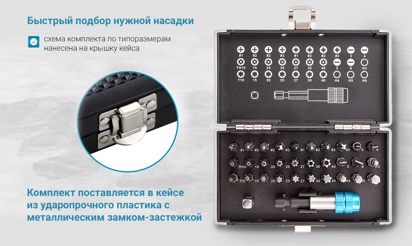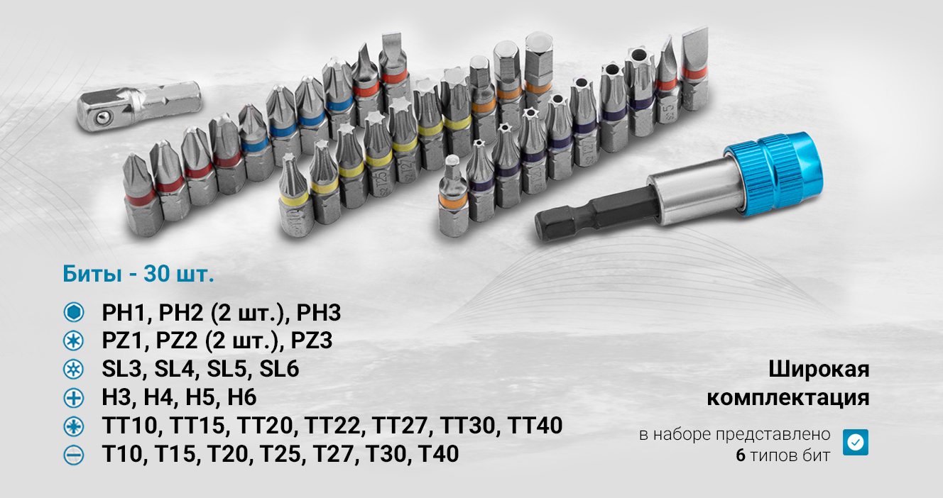 - Биты PH1, PH2×2, PH3; PZ1, PZ2×2, PZ3; SL3, SL4, SL5, SL6; TH10, TH15, TH20, TH25, TH27, TH30, TH40; T10, T15, T20, T25, T27, T30, T40; H3, H4, H5, H6.