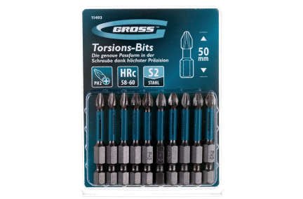 Набор торсионных бит PH2 x 50 мм Gross 11493, 10 шт., предназначен для монтажа и демонтажа резьбовых соединений с помощью ударного шуруповерта. Он незаменим в строительных, слесарных и монтажных работах, в автосервисах, при проведении ремонта в доме. Торсионная зона способна пружинить, за счет чего она частично амортизирует тангенциальный удар от шуруповерта. Такое решение позволяет равномерно распределить нагрузку по бите и избежать поломки шлица.