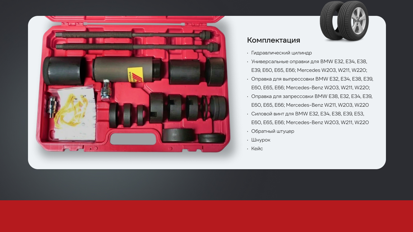Набор для снятия и установки сайлентблоков подрамника с гидроприводом JTC 4820 - это комплект универсальных изделий, которые используются для демонтажа элементов виброизоляции, представляющих собой, в большинстве случаев, металлические изделия покрытые слоем эластомера. Инструменты активно применяются в сервисных центрах по ремонту и обслуживанию автомобилей марки Mercedes-Benz и BMW совместно с гидравлическим насосом, - это позволяет увеличить производительность рабочих и самого сервиса в целом. Максимально возможное усилие, создаваемое насосом - 15 т, при мощности - 10000 psi (700 кг/см2). Комплект разработан для использования совместно с адаптером JTC CP350. Габариты кейса 525х370х150 мм.