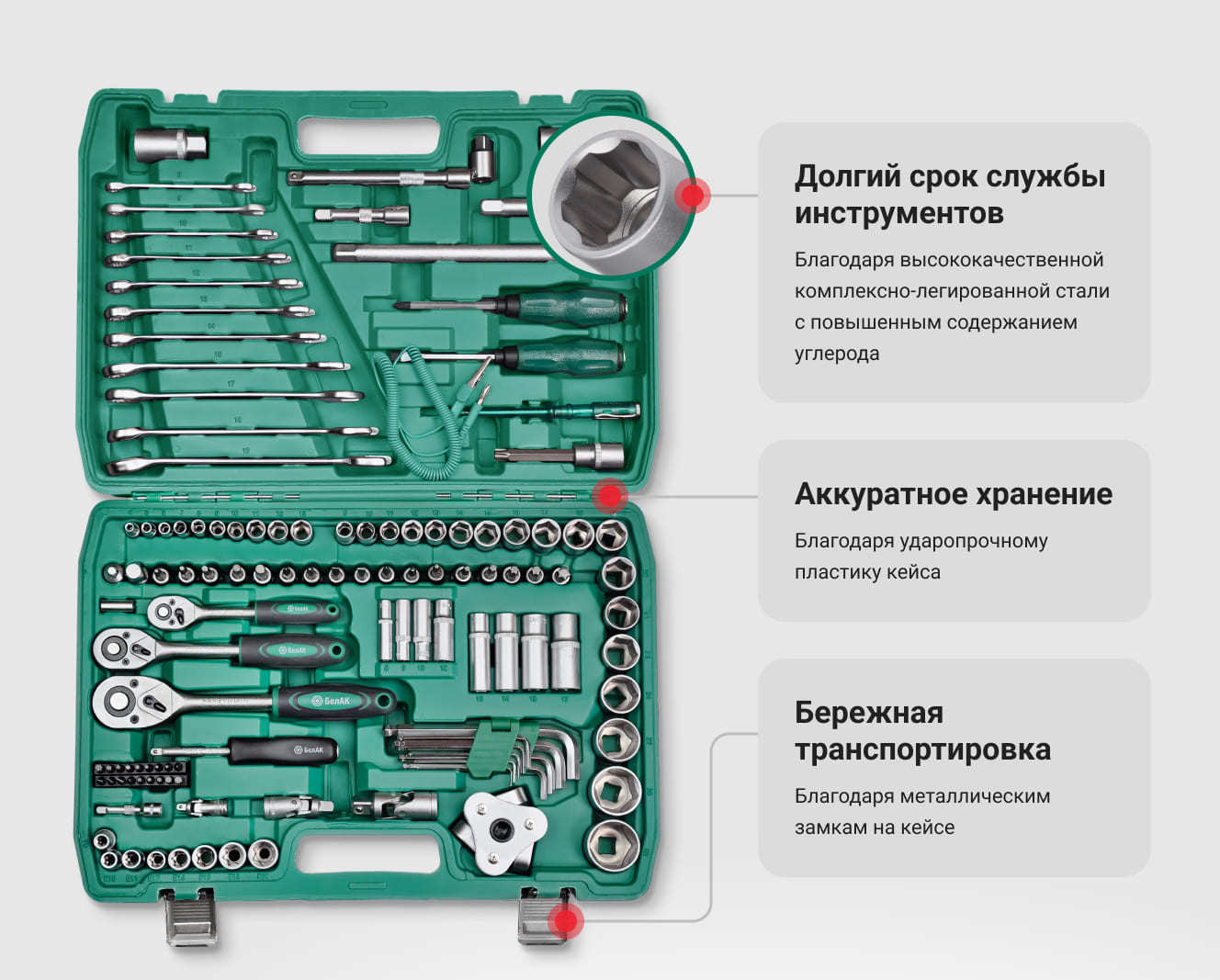 Набор инструментов выполнен из специальной комплексно легированной стали с повышенным содержанием углерода. Прочные металлические замки и эргономичный ударопрочный кейс делают набор головок с трещоткой эффективным и мобильным.