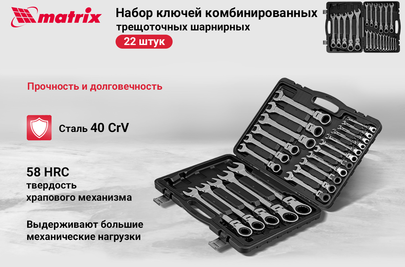 Набор комбинированных трещоточных шарнирных ключей MATRIX 22 шт. 14800