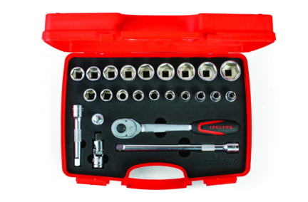 Набор шестигранных торцевых головок IZELTAS 24 предмета 1113002024 включает в себя трещотку, необходимые приспособления и широкий ассортимент головок. Скользящий вороток, шарнирный удлинитель и переходник существенно упрощают процесс выполнения крепежных работ в труднодоступных местах. Трещоточный ключ удобен в использовании, он имеет реверсивный переключатель и эргономичную накладку на ручке.