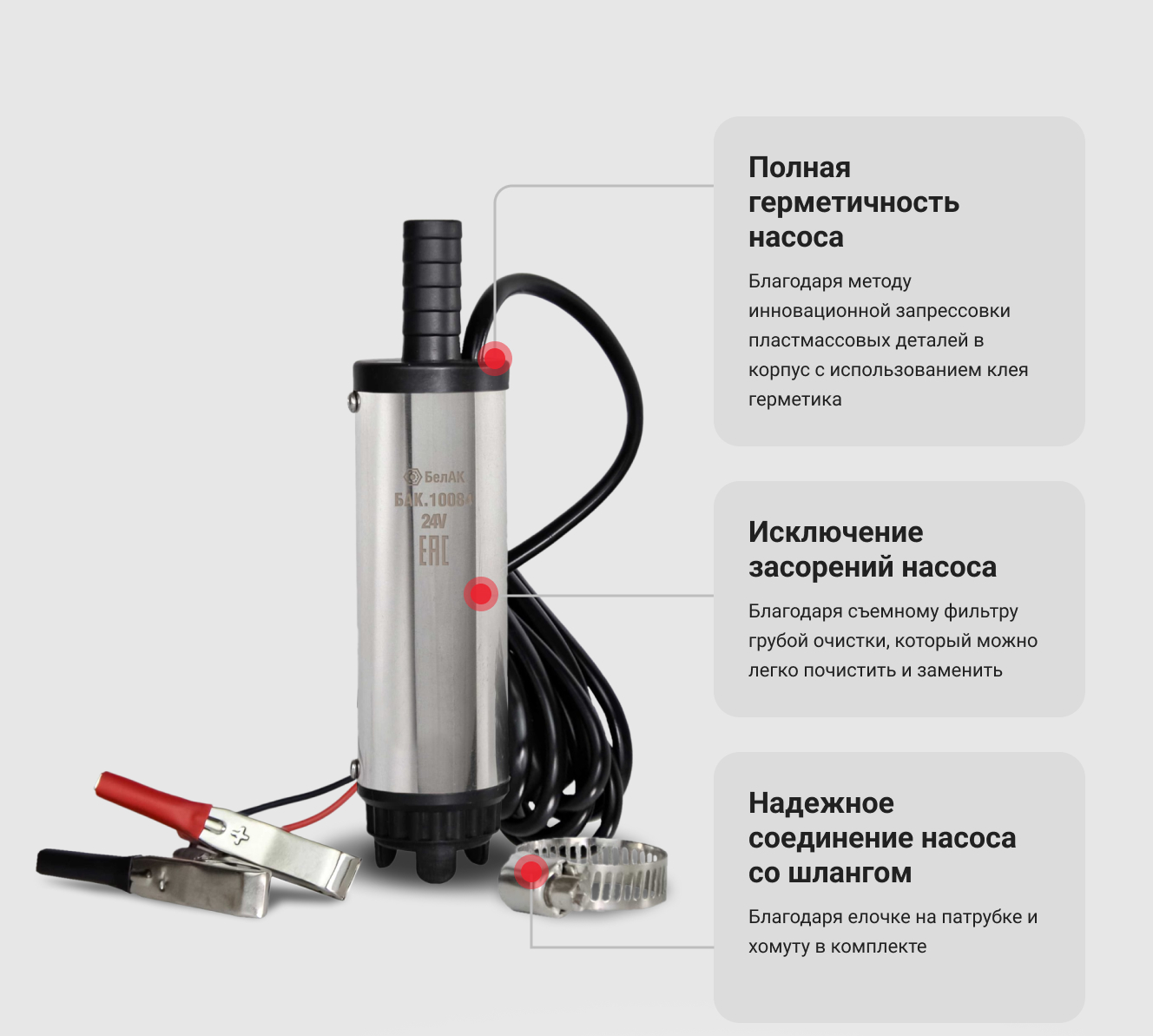 Все модели погружных насосов перекачки топлива бренда «БелАК» имеют фильтр очистки топлива. Насос для ГСМ оснащен специальной «елочкой» на патрубке, в комплекте хомуты для шланга, что гарантируют надежное крепление шланга к насосу. Наличие на нижней части насоса специальных ножек исключают присасывание ко дну емкости во время перекачки топлива.