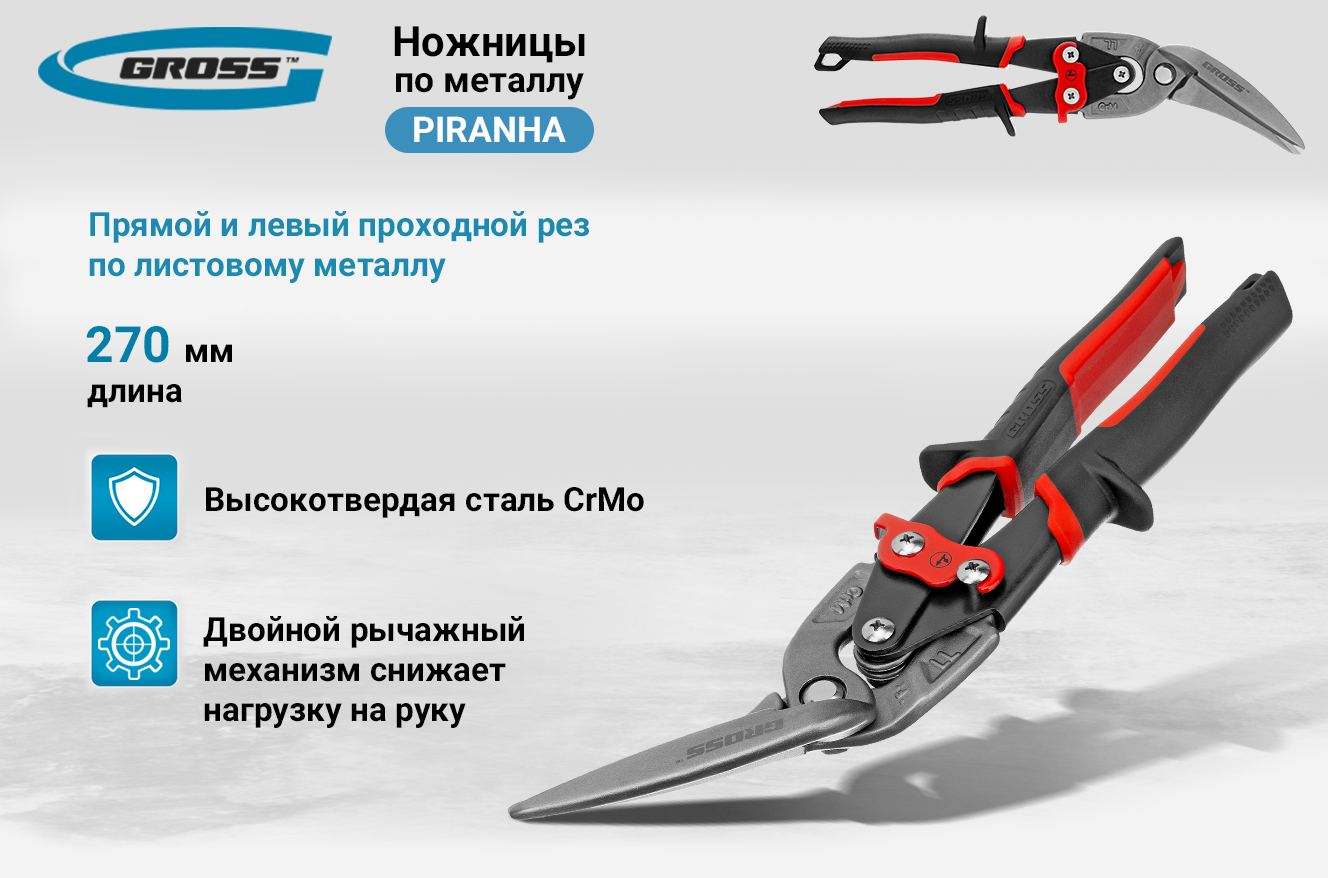 Ножницы по металлу GROSS PIRANHA 270 мм, прямой и левый проходной рез, сталь - СrMo, двухкомп. рук-ки 78331