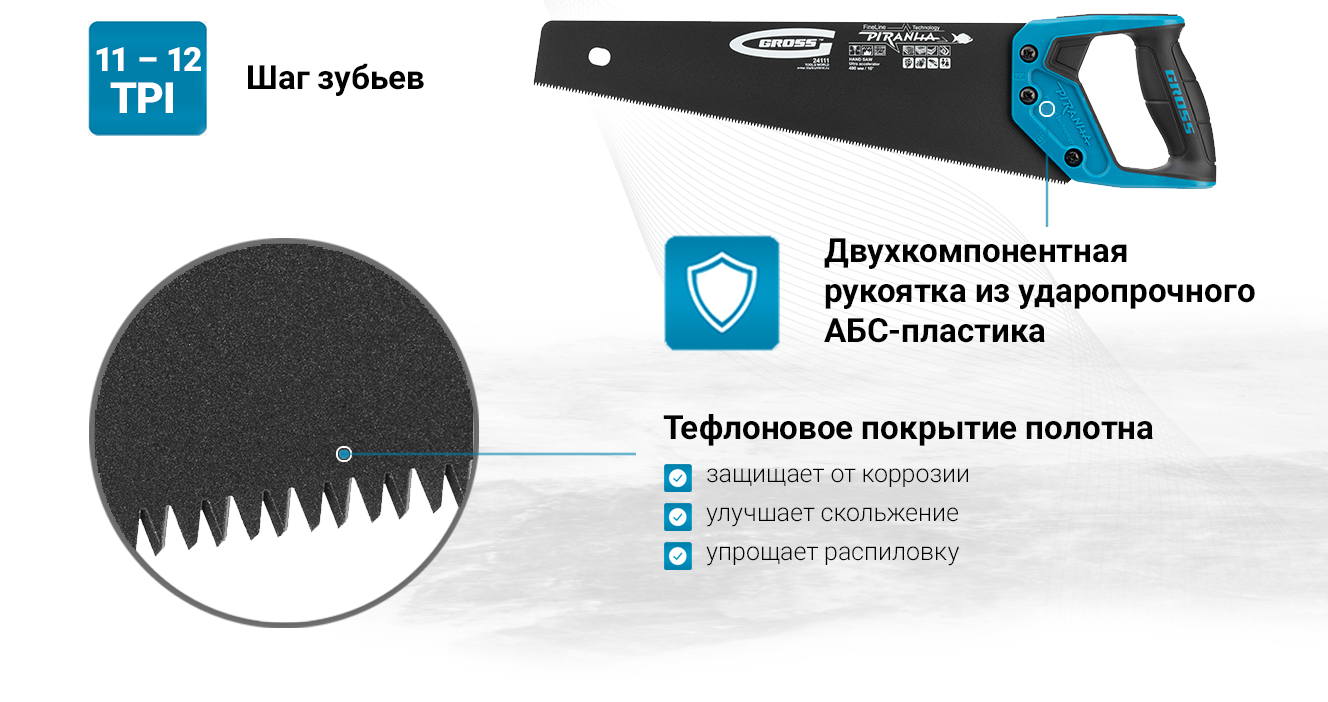 Комфорт при работе Двухкомпонентная рукоятка обеспечивает надежный хват и удержание ножовки GROSS PIRANHA 24111. |