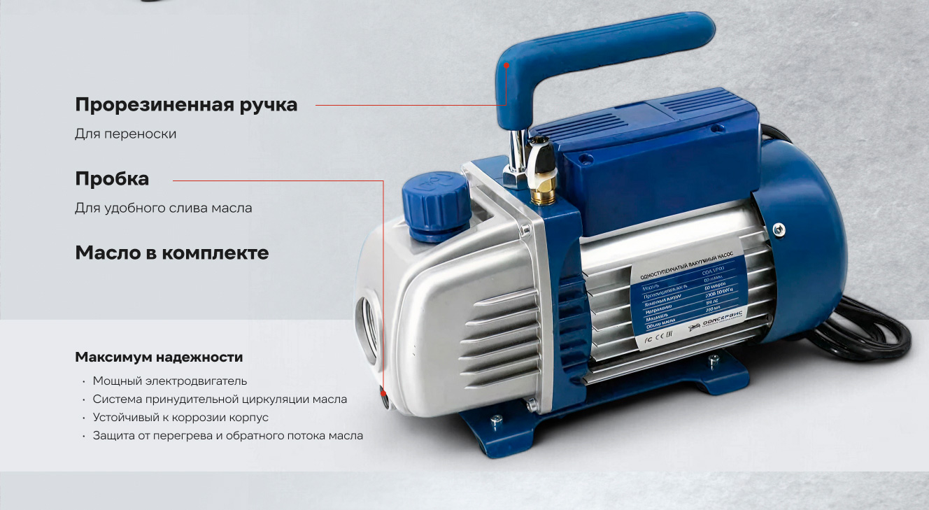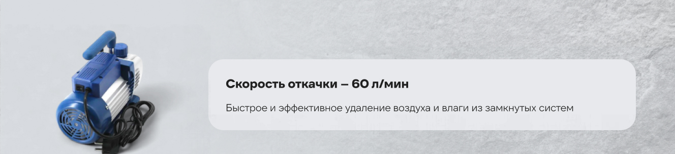 - Максимальная производительность – скорость откачки 60 литров в минуту позволяет быстро и эффективно удалять воздух и влагу из замкнутых систем, сокращая время работы
