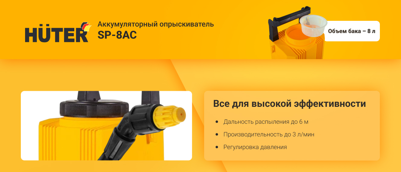Опрыскиватель аккумуляторный Huter SP-8AC с распылительными насадками в комплекте упростит работу по обработке растений, почвы, различных поверхностей.