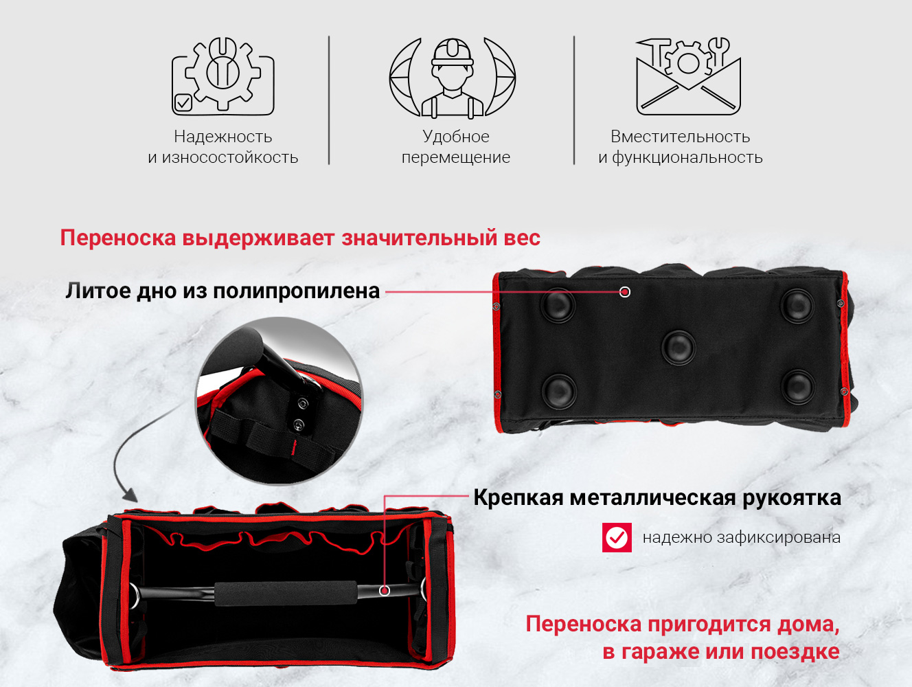 В удобных карманах можно расположить все необходимые инструменты. Переноска пригодится дома, в гараже или в поездке.