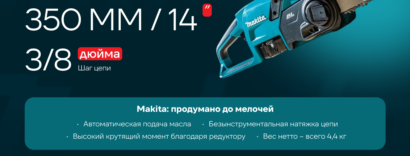 Makita LXT DUC357SF с четырнадцатидюймовой шиной в моем владении уже год. Приобретена была осенью 2024. Боевое крещение прошла при реконструкции старого дома. С ее помощью убирались старые потолки и перегородки. С досками справилась с честью. Перед пропилом стены для монтажа окна тоже не спасовала. Бревно пятидесятилетней сушки пилила уверенно. И сразу же был выявлен огромный плюс – отсутствие гари и выхлопа. Подготавливать никак не надо. Кожух с шины снял, кнопку нажал, пили в свое удовольствие. За год эксплуатации пилилось многое и часто. И в зимнем заснеженном лесу на морозе прибирался валежник и велась расчистка лыжной трассы. И в жарком июле распил березового горбыля и соснового бруса на дрова. Уверенно пилит и сухую березу, и рыхлую липу, и дубовые доски. Аккумулятор к ней хотелось емкостью побольше. Трехамперный позволяет на морозе сделать порядка 10-12 спилов со ствола мерзлой осины толщиной сантиметров в 20-30. В теплое время года заряда хватает минут на 20-30 работы. Постоянной работы. Удобно, что на акке есть индикатор заряда. Штатная станция аккумулятор от полного разряда до 100% заряжает минут за 20. Утечка масла из бачка. Её нет. Абсолютно. Никаких потеков при хранении. Механизм смазки расходует масло экономно, но без перерыва и дефицита. Очень помогает тормоз цепи, срабатывает быстро, остановка цепи мгновенная. При отпускании кнопки цепь также останавливается сразу, без свойственного бензиновым инерционного движения. Цепь. За год эксплуатации еще не точил (похоже сейчас настает пора поточить, опил мелковат стал). Цепь не тянется как пластилиновая и не требует постоянной протяжки. Хотя если надо подтянуть – это не проблема. Механизм фиксации шины и подтягивания цепи удобен и имеет безключевое исполнение. Все отлично настраивается, фиксируется и подтягивается удобной ручкой и винтовым колесом. Рез держит. Пил получается ровный даже при продольном распиле доски. Облой, хлипкий пластик корпуса – это все мимо, это не про Макиту. Тут все сделано из крепкой, качественной пластмассы (каюсь ронял). В общем честно, советую. Коплю на аккумулятор :)