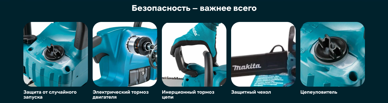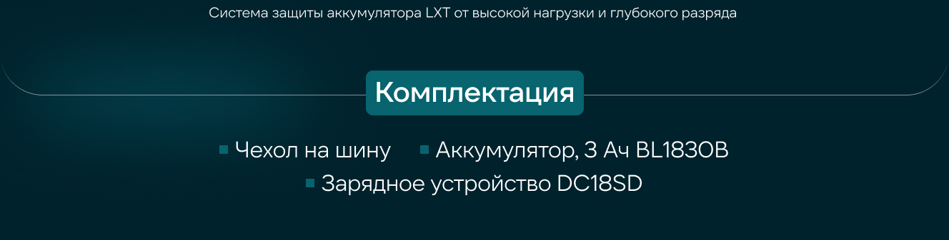 Максимальная скорость цепи составляет 7.7 м/с. Безынструментальная крышка цепи позволит быстро подтянуть провисшую цепь или заменить режущую гарнитуру. Инерционный тормоз остановит цепь за доли секунды. Цепная пила работает на аккумуляторной платформе LXT. В комплект входит BL1830B х1 штука и зарядное устройство DC18SD. Данный тип аккумулятора подходит более чем для 400 инструментов Makita из линейки LXT, а это значит, что его можно использовать не только с садовым инструментом, но и с шуруповертами и перфораторами Makita.
