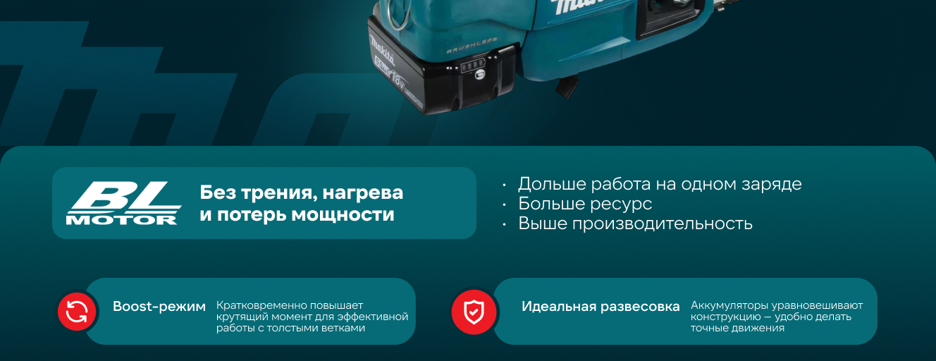 Мощный бесщеточный двигатель не требует обслуживания. Boost-режим позволяет кратковременно повысить крутящий момент двигателя для более быстрой распилки древесины.