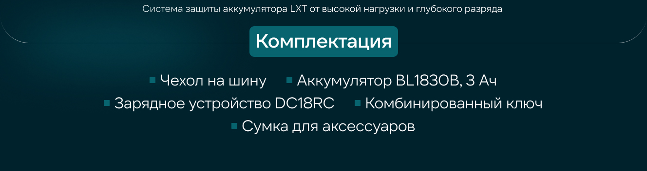 В комплект входит аккумулятор 3 Ач и быстрое зарядное устройство DC18RC. Аккумулятор заряжается до 100% за 22 минуты. Данный тип аккумулятора LXT подходит более чем для 400 инструментов Makita из линейки LXT, а это значит, что его можно использовать не только с садовым инструментом, но и с шуруповертами и перфораторами Makita.