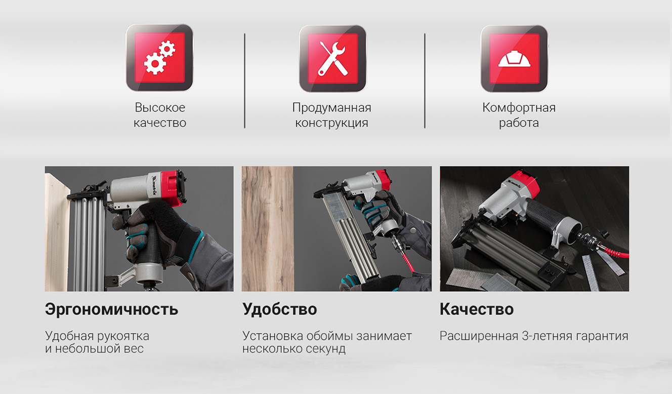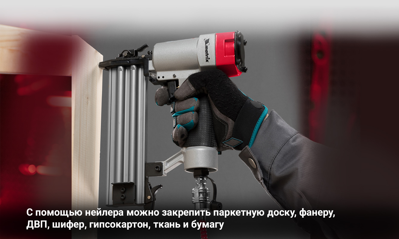 - Широкая сфера применения пневматического нейлера для гвоздей MATRIX 57410