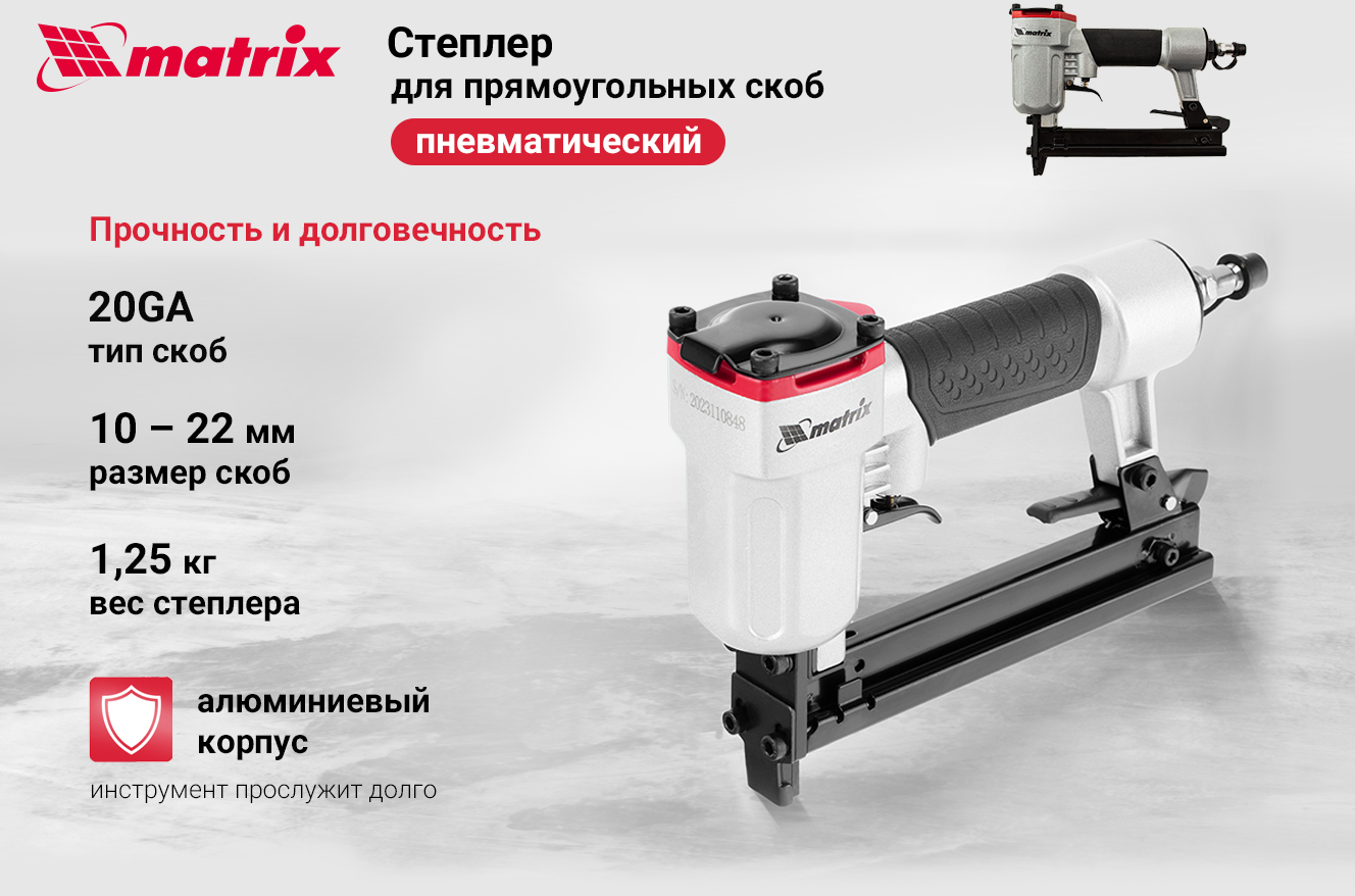 Пневматический степлер MATRIX 57420 используется в производственной сфере деятельности, так как обладает высоким уровнем эффективности в работе. Степлер способен быстро и легко забивать скобы в деревянные поверхности, крепя к ним различные материалы, такие как: гипсокартон, фанеру, ДВП, а также кожу, ткань и пр. Степлер имеет магазин на 160 скоб размерами 10 - 22 мм.